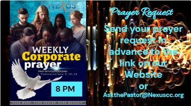 Nexus Church for Weekly Corporate Prayer—Pure Word, Pure Prayer, Pure Worship—Tuesdays at 8:00 PM Inspired by 1 Thessalonians 5:16-18. “Pray without ceasing”—we unite in intercession for our church, community, and world. All are welcome!