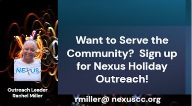 Want to Serve the Community? Sign up for Nexus Holiday Outreach! See Outreach Leader Rachel Miller or email her.